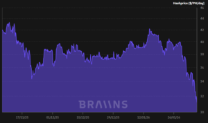 El hashprice muestra una tendencia a la baja pronunciada, desde el 14 de enero de 2026, lo que le llevó a romper su récord mínimo anterior de 34 USD/PH/día, registrado el pasado 21 de noviembre de 2025. Esta métrica representa los ingresos brutos que un minero puede generar según su capacidad de cómputo (hashrate) en un periodo de 24 horas, calculados en este caso por petahashes (PH).