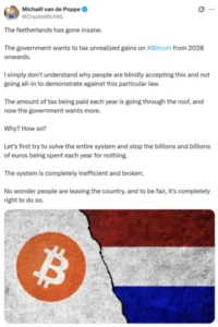 El destacado analista neerlandés de criptomonedas Michaël van de Poppe calificó al plan como “una locura”, argumentando que aumentaría considerablemente la carga fiscal anual y empujaría a los residentes a abandonar el país. “No es de extrañar que la gente se vaya del país y, para ser justos, es totalmente lógico que lo hagan”, escribió.